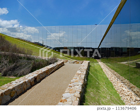 Wheelchair ramp of two uneven horizontal surfaces, street view, window with sky reflection