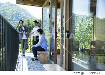 バルコニーで談笑するビジネスマン