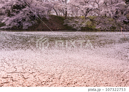 山形県霞城公園内の山形城址のお堀の桜と花筏