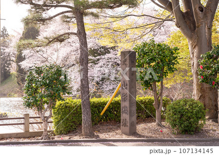 山形県霞城公園内の山形城址のお堀の桜と石銘板