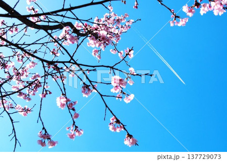 桜越しに見上げる快晴の空と飛行機雲 希望と旅立ちのイメージ