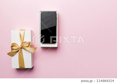 Opened gift box with ribbon and phone on color background, top view. Blank open box packaging mockup , Template for your design - branding mockup