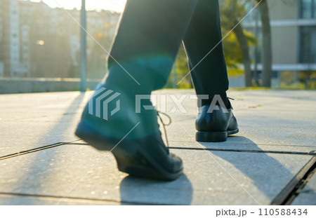 Legs of a businessman in fashionable shoes walking outdoors. Business concept. Close-up view to the businessman in a black new shoes walks on the street. Stylish men wears. Low angle. Rear view.