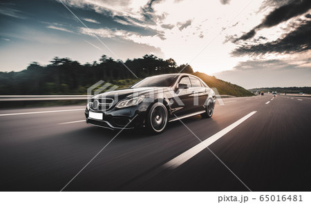 Wide modern smooth empty asphalt highway sharp turn sharp with bright white and double yellow marking sign line. Speed, safety, comfortable journey and professional road building concept.