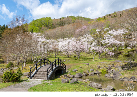 函館のダム公園の桜と橋のある風景