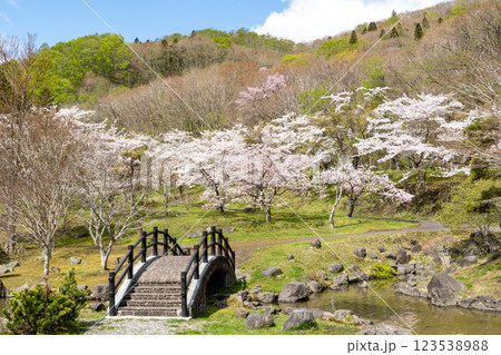 満開の桜と橋のある公園の風景