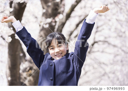 桜の前で万歳をする新中学生 小学校卒業 入学イメージ