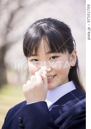 桜の花を持つ新中学生 小学校卒業 入学イメージ