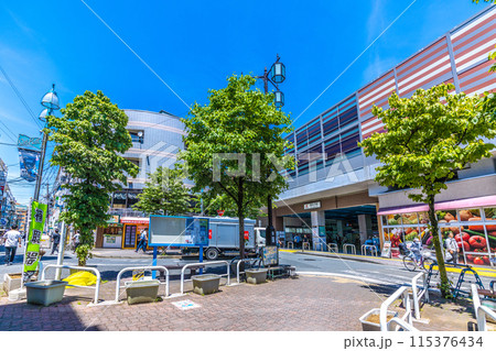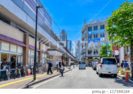 日本の川崎都市景観 6月。東急電鉄 新丸子駅前の商店街・新丸子東栄会などを望む