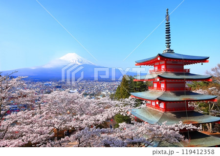 山梨県富士吉田市 春の新倉山浅間公園 富士山と五重塔と桜