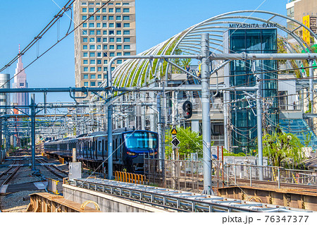 日本の東京都市景観 渋谷駅前を走る電車。奥に宮下公園