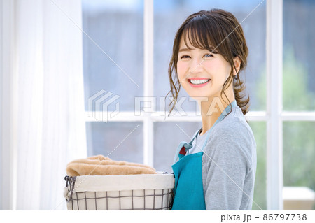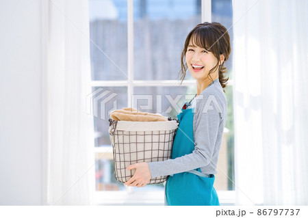 家事をする洗濯カゴを持ったエプロン姿の若い主婦