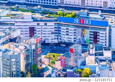 日本の東京都市景観 池袋駅東口などを望む。西武池袋本店の改装工事…=19日