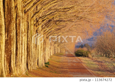 早朝の落葉したメタセコイア並木 滋賀県高島市マキノ町