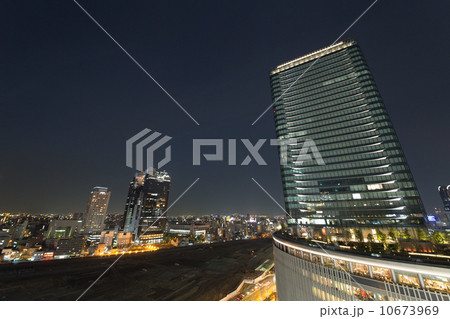 夜の大阪梅田 JR大阪駅前の街並み 大阪ステーションシティとヨドバシカメラ
