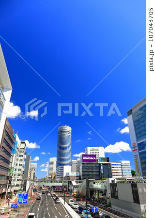 晴天下の新横浜駅ビルと新横浜プリンスホテル