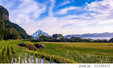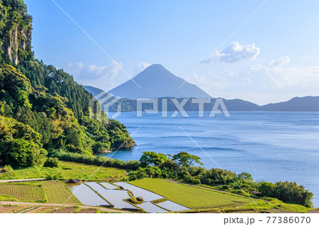 開聞岳と湖と棚田