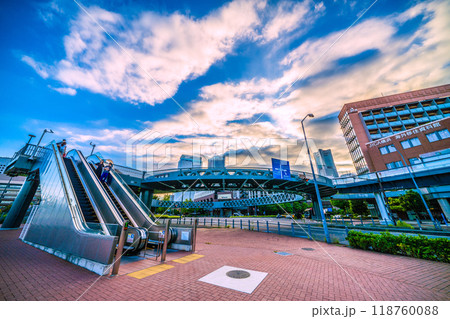 日本の横浜都市景観 新風景。新港サークルウォークやエスカレーター。右奥には横浜ランドマークタワー