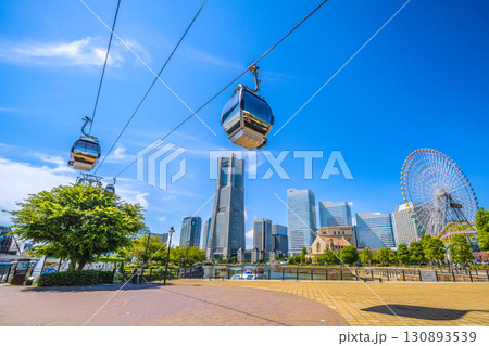 日本の横浜都市景観 …運河パーク駅前・運河パークからロープウェイや横浜ランドマークタワーなどを望む