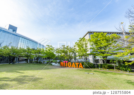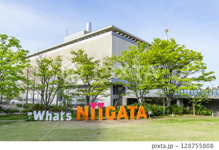 新潟県新潟市 新潟県民会館と文字モニュメント「NIIGATA」