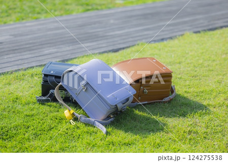 緑の芝生の上のランドセル