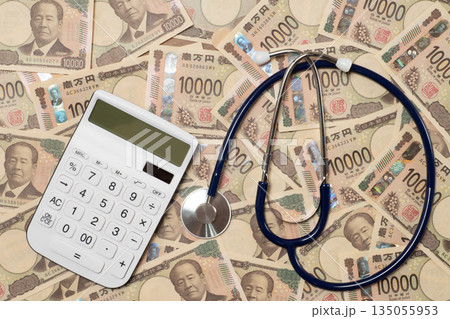 聴診器と電卓と敷き詰められた一万円札