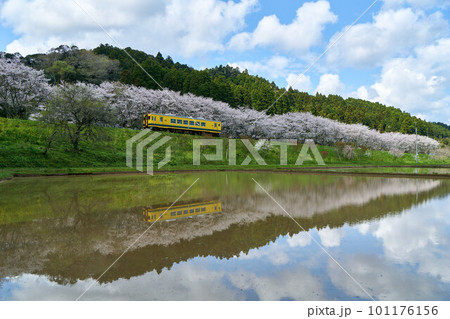 桜並木と菜の花列車の田んぼリフレクション いすみ鉄道 新田野ストレート