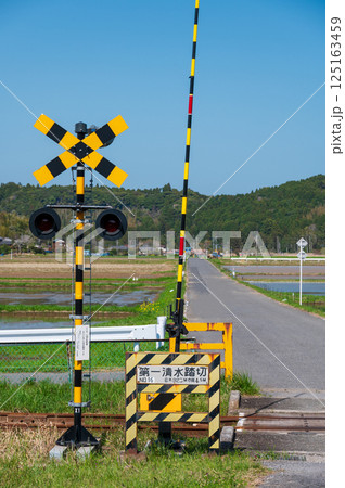 いすみ鉄道新田野駅近くの踏切と菜の花の春風景
