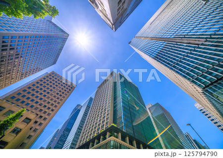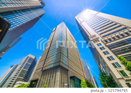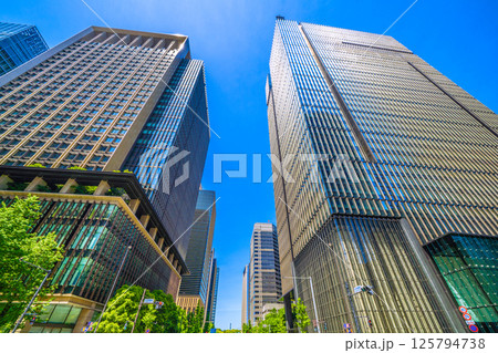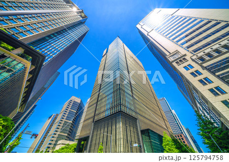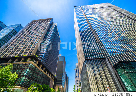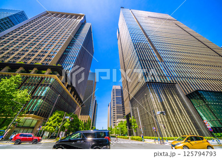 日本の東京都市景観 大手町駅前の交差点からオフィスビル群を望む=5月3日