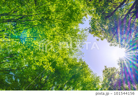 日本の横浜都市景観 青空…太陽光が差し込むクスノキ。希望の光…。花言葉は芳香=20日、横浜市内