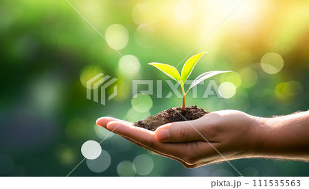 Human hands cradle soil with glowing planet Earth and green sprout. Concept of renewal, hope, sustainability and ecological balance. Perfect for World Cleanup Day and Earth Day awareness.