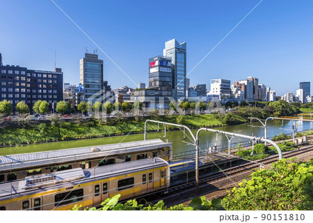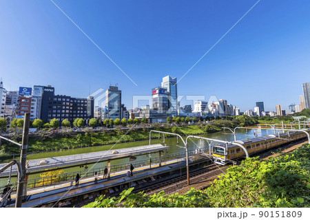 東京の桜名所 外濠公園 新見附橋から望む東京都心の町並み 電車