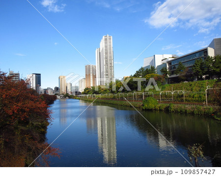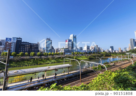 東京の桜名所 外濠公園 新見附橋から望む東京都心の町並み 市ヶ谷方面