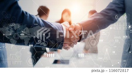 ビジネスパートナーとの握手シーンのアイソメイラスト