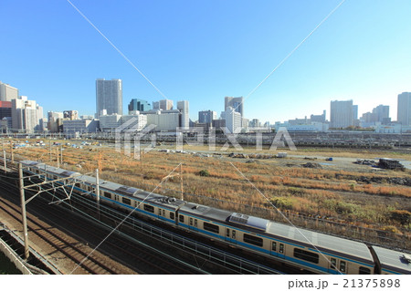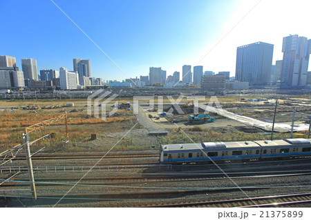 日本の東京都市景観 山手線・京浜東北線の田町ー品川駅間に建設中の高輪ゲートウェイ駅などを望む
