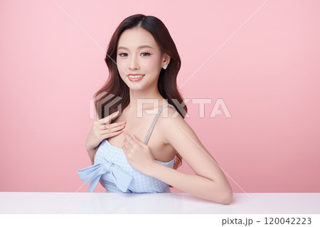 Beautiful young asian woman with clean fresh skin on pink background, Face care, Facial treatment, Cosmetology, beauty and spa, Asian women portrait.