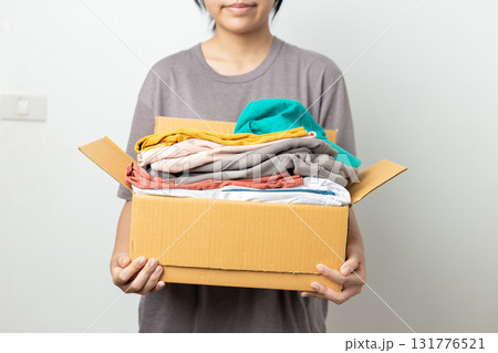 Donation Concept, woman holding clothes with donate box in white background room.