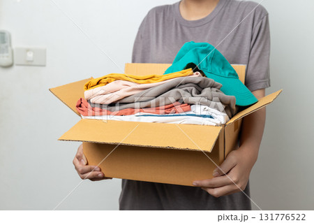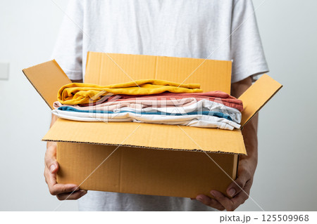 Donation Concept, man holding clothes with donate box in white background room.