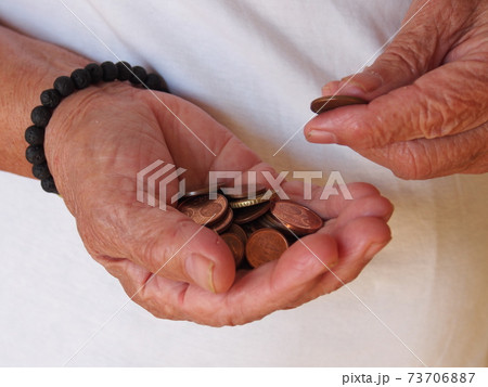 Old woman's wrinkled hands counting small coins