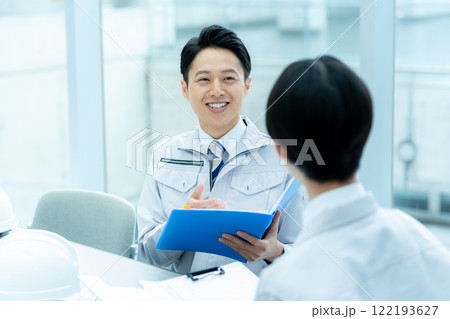 打ち合わせをする作業服を着た男性