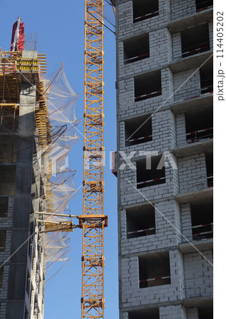 Construction site with cranes against the sky. Construction machinery, construction of skyscrapers.