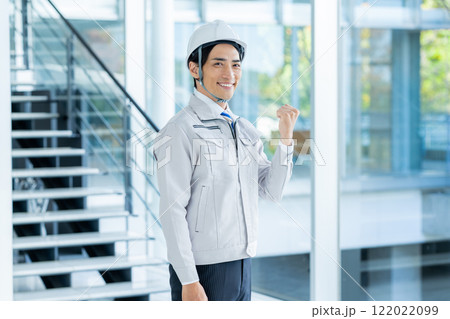 作業服の男性 オフィスビル 見上げる