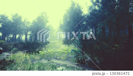 A serene forest path is illuminated by soft sunlight filtering through tall trees. Morning mist envelops the area, creating a tranquil atmosphere filled with lush greenery.