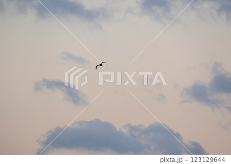 12月の早朝、夜明けとともにカモメが飛び交う。兵庫県西宮市の香櫨園浜で撮影