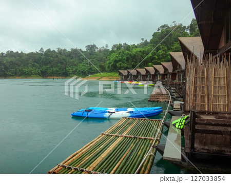 Serene Waterfront Escape: Tranquil water cabins peacefully sit on the waters edge with canoes as a symbol of travel