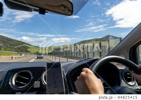 北海道の道路を運転している自動車からの景色