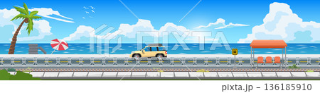 Horizontal or Landscape of flat vector panoramic illustration of a yellow SUV driving along a scenic coastal asphalt road. With a beach palm tree and train stop under a bright blue sky.