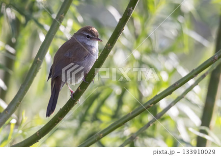Cettis warbler perched on a branch in Arkemheenpolder, Netherlands during a sunny day