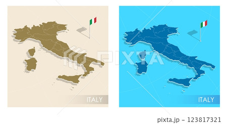 Italy country flag installed on geographic positioning map point of country territory. Italian commonwealth banner on land and sea. Festive patriotic HD format template for independence day