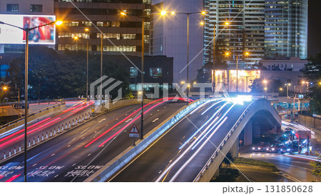 Night City Street with Heavy Rain Streetlights and Blurred Car Lights Along Wet Asphalt Pavement